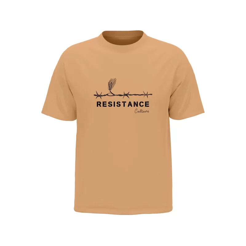 متن “Resistance” روی تیشرت به معنای “مقاومت” و تصویر سنبله گندم در میان سیم خاردار مفهومی عمیق از زندگی، امید و ایستادگی در شرایط سخت را بازتاب میدهد.