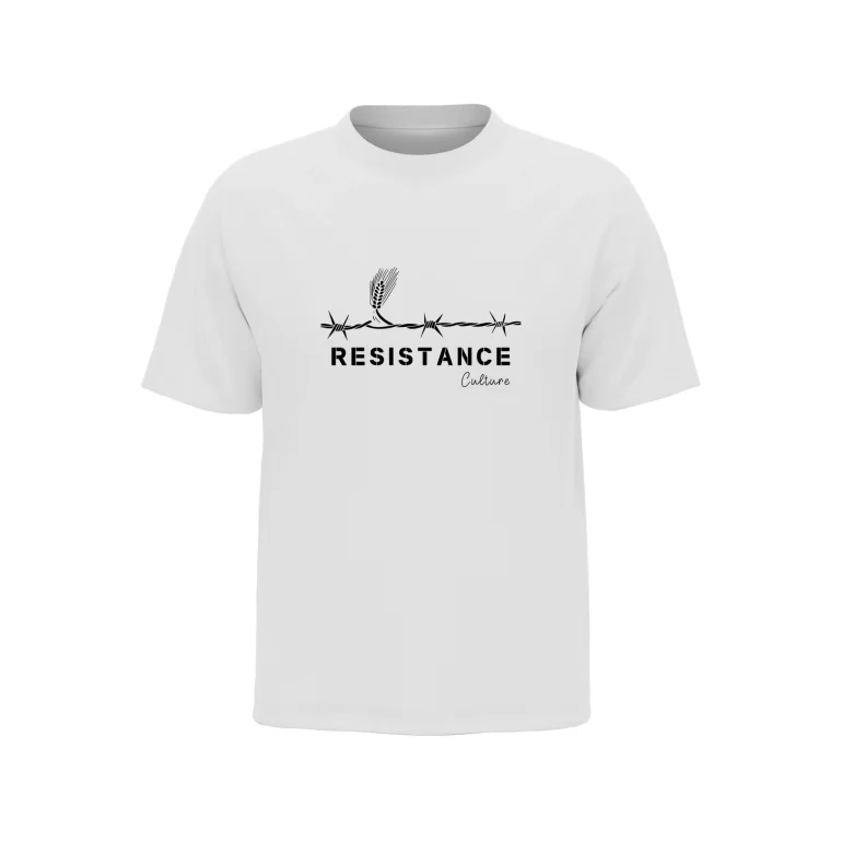 متن “Resistance” روی تیشرت به معنای “مقاومت” و تصویر سنبله گندم در میان سیم خاردار مفهومی عمیق از زندگی، امید و ایستادگی در شرایط سخت را بازتاب میدهد.