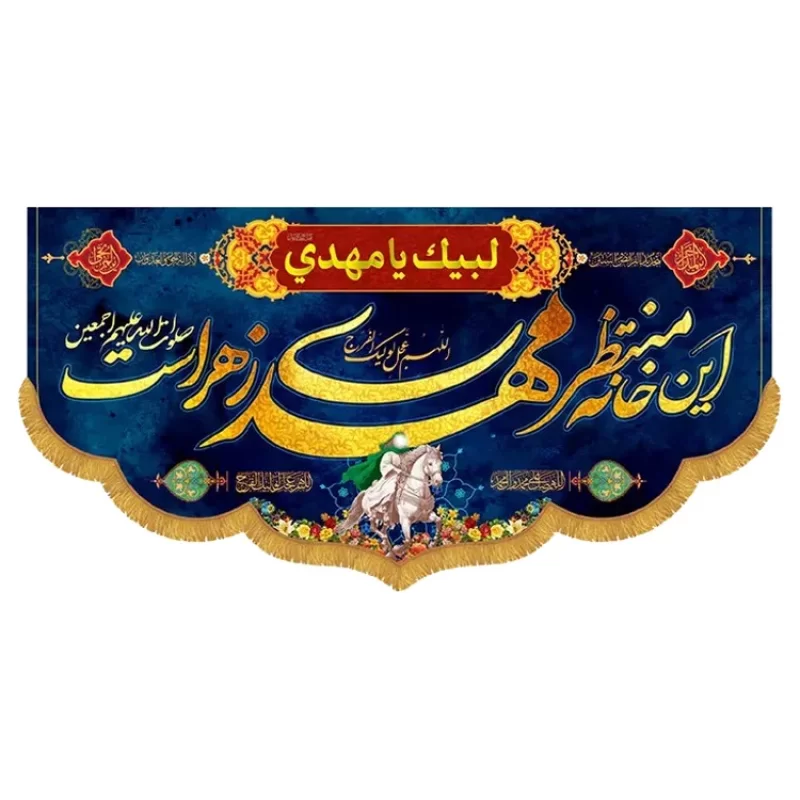 کتیبه مخمل افقی طرح این خانه منتظر مهدی زهراست از مخمل درجه‌یک قابل شست‌وشو تهیه شده است. چاپ طرح به روش سابلیمیشن انجام شده و ماندگاری و وضوح رنگ بالایی دارد. این محصول در سه سایز 45×90، 70×140 و 140×280 سانتی‌متر عرضه می‌شود و برای استفاده در منزل، هیئت یا محل کار مناسب است.