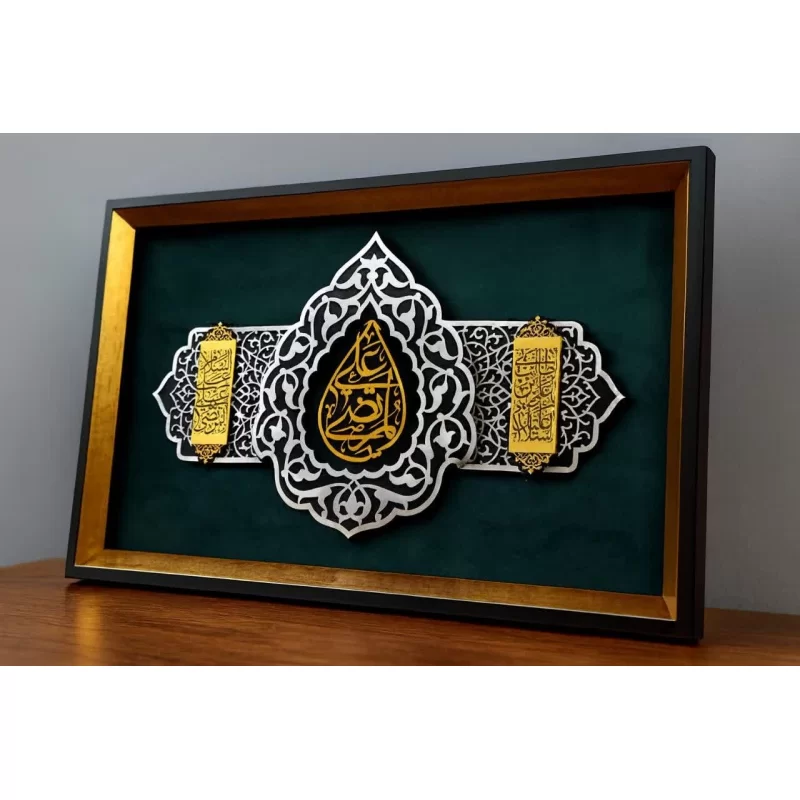 تابلوی «مرتضی علی» به‌صورت برجسته و با ترکیبی چشم‌نواز از رنگ‌های سبز و طلایی طراحی شده است. کتیبه طلایی «سلام بر علی‌ابن‌ابی‌طالب» در کنار طرح‌های اصیل اسلامی، جلوه‌ای فاخر، معنوی و متمایز به این اثر بخشیده و آن را به انتخابی شایسته برای فضاهای خاص تبدیل کرده است.