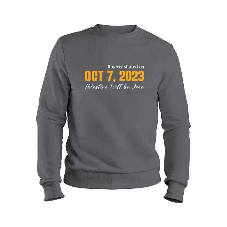 تاریخ 7 اکتبر 2023 که روی سینه تیشرت چاپ شده، یادآور روز آغاز جنگ غزه و عملیات «طوفان‌الاقصی» است؛ رویدادی تأثیرگذار که توجه افکار عمومی جهان را به تحولات فلسطین جلب کرد و معادلات سیاسی و رسانه‌ای منطقه را وارد مرحله‌ای تازه ساخت. این تاریخ، بار معنایی تاریخی و نمادین داشته و به تیشرت هویتی مفهومی و تأمل‌برانگیز می‌بخشد.