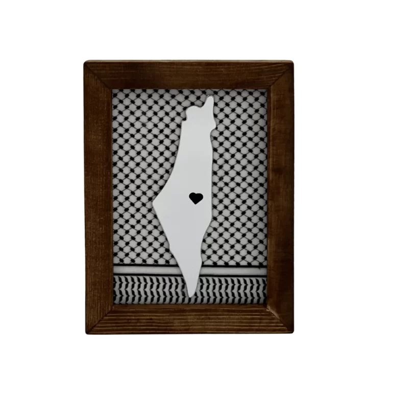 بدنه قاب از چوب با پرداخت تمیز و رنگ گرم ساخته شده که حس اصالت و ماندگاری را القا می‌کند. در مرکز قاب، فرم فلسطین از جنس پلکسی با برش دقیق قرار گرفته و یک قلب کوچک در میانه آن، بار احساسی و نمادین اثر را تقویت می‌کند. پس‌زمینه پارچه‌ای با الگوی کوفیه، هویت بصری فلسطینی را کامل کرده و هماهنگی چشم‌نوازی میان متریال و معنا ایجاد می‌کند.