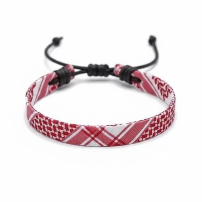این دستبند با الهام از طرح چفیه، نماد استقامت، هویت و پیوند با فرهنگ و میراث ملتها طراحی شده است.