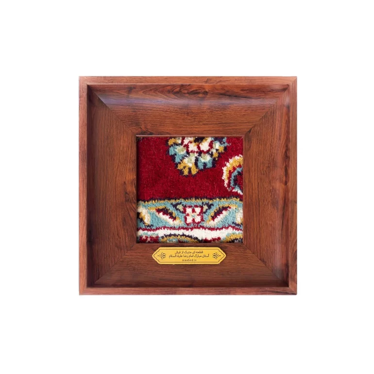 این محصول قطعه ای از فرش‌های متبرک و قدیمی حرم حضرت علی بن موسی الرضا (علیه السلام) است. جنس قاب این محصول چوبی و رنگ آن قهوه ای بوده و ابعاد دور تا دور قاب 19x19 سانتی متر می‌باشد.