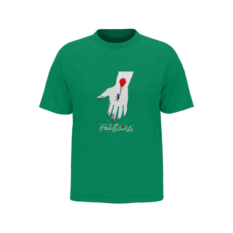 - توضیح طرح: به معنای “برای انسان گرد آمدهایم” روی سینه تیشرت پیامی روشن از همبستگی، نوع دوستی و ارزش های انسانی را منتقل میکند و جلوهای متفاوت به استایل شما میبخشد.