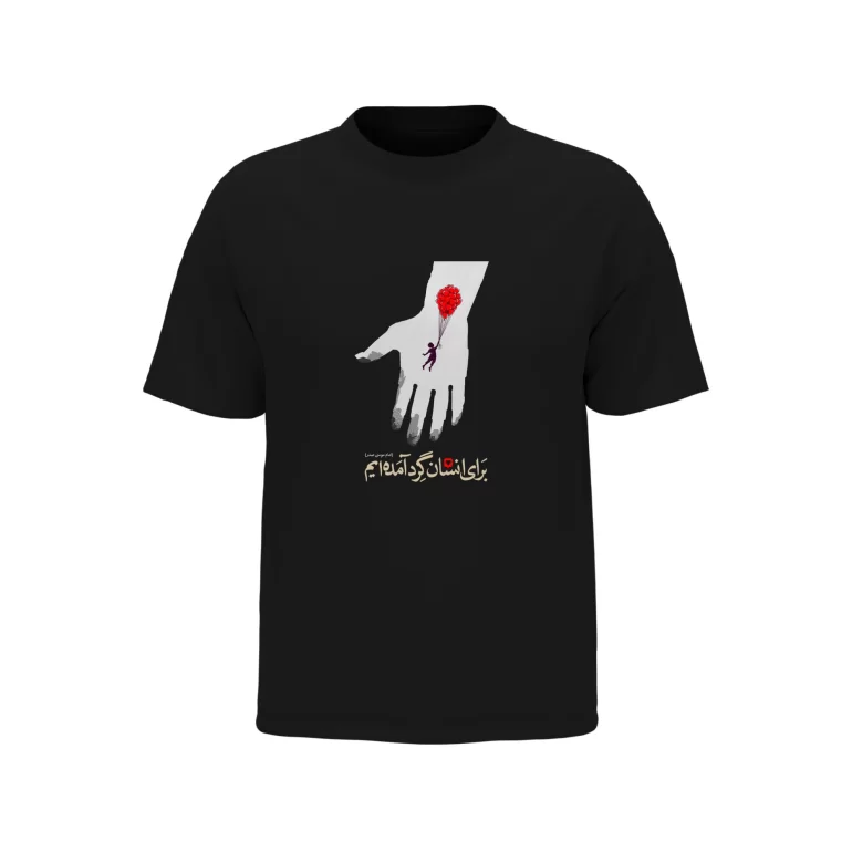 - توضیح طرح: به معنای “برای انسان گرد آمدهایم” روی سینه تیشرت پیامی روشن از همبستگی، نوع دوستی و ارزش های انسانی را منتقل میکند و جلوهای متفاوت به استایل شما میبخشد.