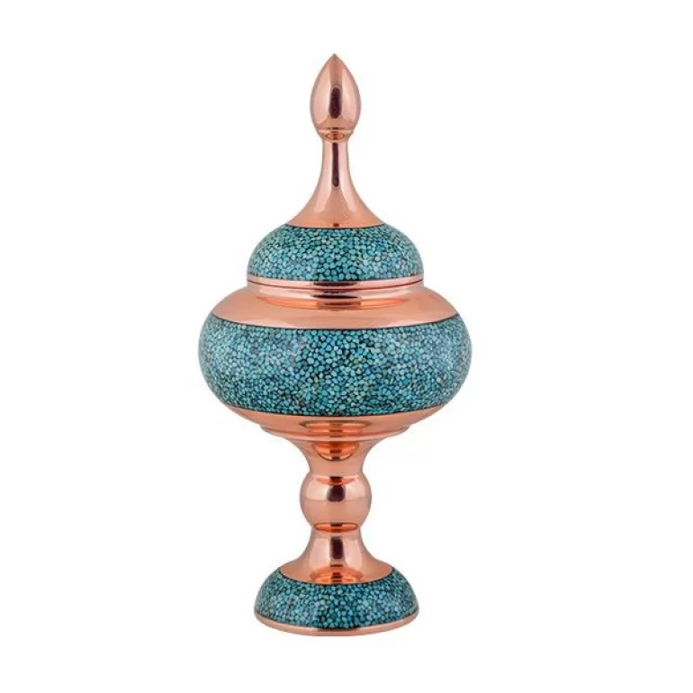 فیروزه از جمله جواهراتی است که همیشه مورد نظر و توجه علاقمندان به زیورآلات بوده است.این سنگ گران بها که که در واقع فسفات آبدار طبیعی آلومینیم می باشد که در دستگاهی کج وجهی متبلور شده و پس از آن به عنوان جواهر استفاده شده و داری طیف رنگی از آبی روشن تا سبز می باشد.هنر فیروزه کوبی از جمله هنرهای صنایع دستی بوده که زیبایی و گیرایی خاصی همراه خود دارد.مصنوعات مس و فیروزه، شامل مصنوعاتی است که از جنس مس ساخته شده و مزین به هنر فیروزه کوبی می باشند. شکلات خوری فیروزه کوب 30سانتی متری، از جمله آثار زیبا و ارزشمنده این شاخه می باشد.
