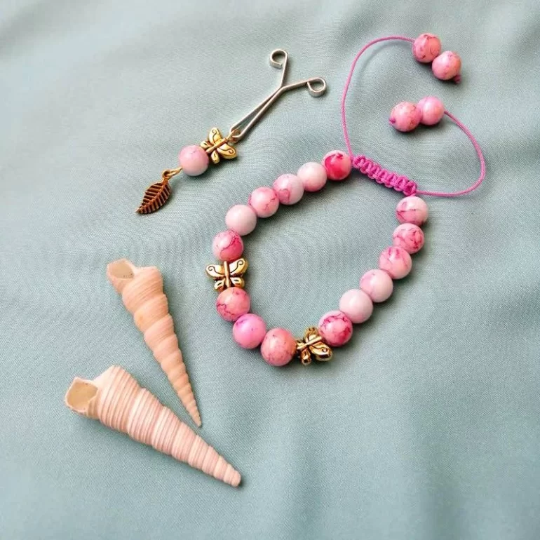 ست دستبند و گیره روسری طرح پریا. طرحی دخترانه ترکیبی از مهرهای رنگی و پروانه های طلایی. همراه با گره کشویی که با قابلیت کوچک و بزرگ شدن و تنظیم به روی دست که با ظرافت عالی مونتاژ شده توسط بانوان ایرانی .