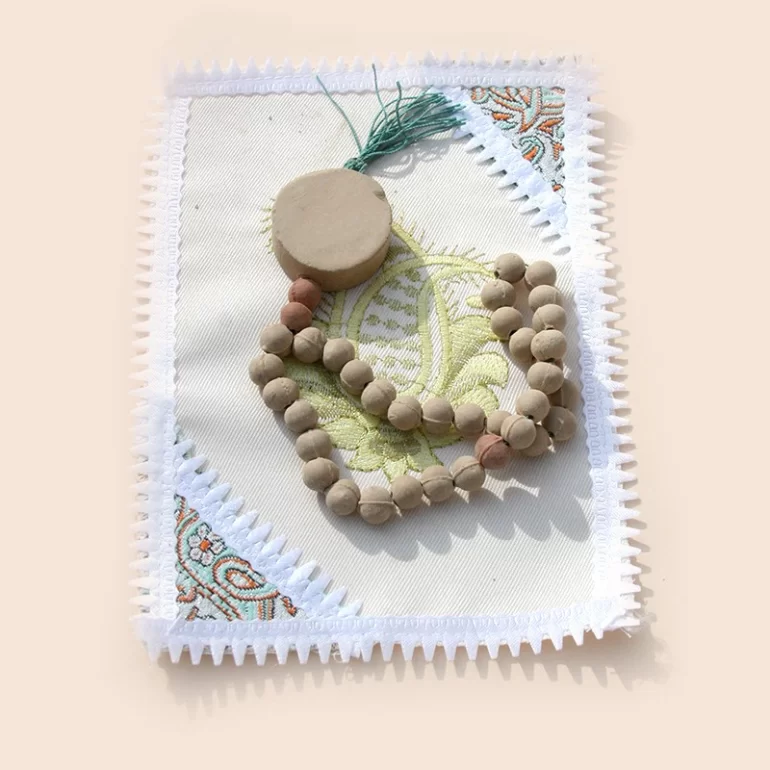 تسبیح 33 دانه تربت قالب کوره ای همراه با مهر تربت که در بالای تسبیح قرار دارد. (امام صادق علیهالسلام فرمودند: هرکس تسبیحی از تربت قبر امام حسین علیهالسلام همراه داشته باشد، تسبیحگو نوشته میشود؛ هر چند با آن تسبیح نگوید).
