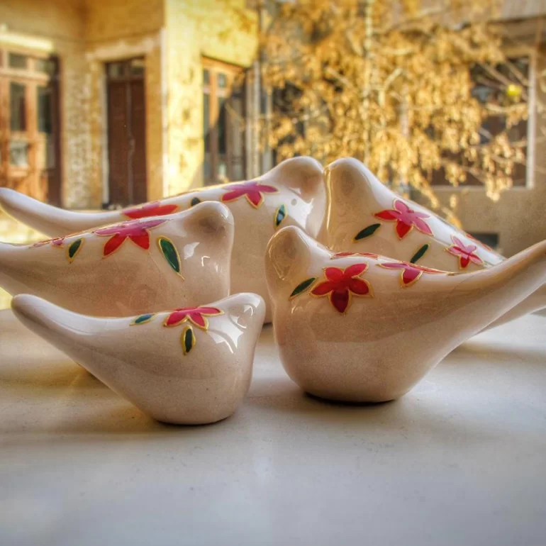 این مدل پرنده ها لعاب سفید خورده اند و روی آن با ویترای تزیین شده که طرحی کاملا متفاوت با سایر طرح های پرنده هاست .