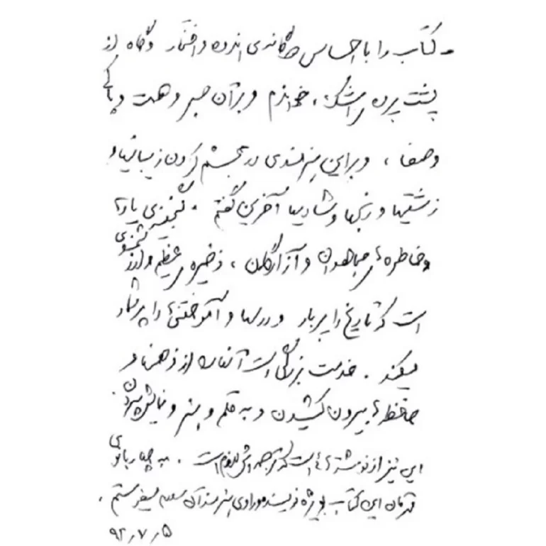 کتاب را با احساس دوگانهی اندوه و افتخار و گاه از پشت پردهی اشک، خواندم و بر آن صبر و همت و پاکی و صفا، و بر این هنرمندی در مجسّم کردن زیبائیها و زشتیها و رنجها و شادیها آفرین گفتم. گنجینهی یادها و خاطرههای مجاهدان و آزادگان، ذخیرهی عظیم و ارزشمندی است که تاریخ را پربار و درسها و آموختنیها را پرشمار میکند. خدمت بزرگی است آنها را از ذهنها و حافظهها بیرون کشیدن و به قلم و هنر و نمایش سپردن.