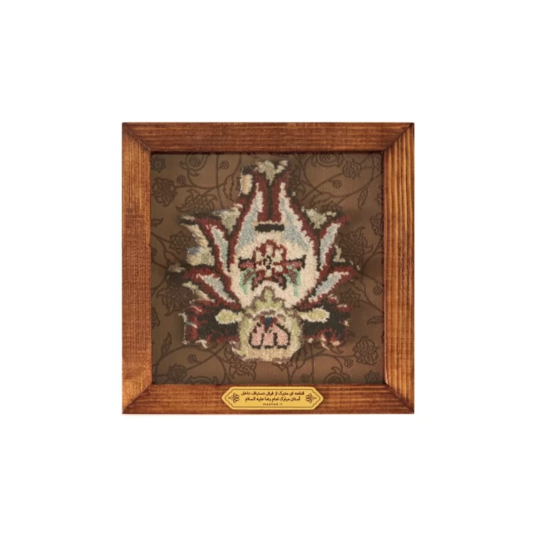 این محصول قطعه ای از فرشهای متبرک و قدیمی حرم حضرت علی بن موسی الرضا علیه السلام میباشد. جنس قاب این محصول چوب بوده و ابعاد دور تا دور قاب 19x19 سانتی متر میباشد.